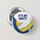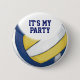 Personalized Volleyball button tells everyone it's your day. Part of a fun, bold blue and yellow Volleyball design, set of 12, essential for your sports themed party. Party on!