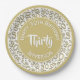 This design is a gold and white random number pattern with milestone number 30 repeated in varied sizes and angles.  Your text is printed on the white circle in the centre.  The design is trimmed with white and gold rings around the rim.