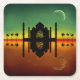 Orient night illustration: A mosque and palms silhouette on a night sky background with the moon and stars reflecting on water.