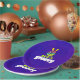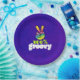 Trippy cool paper plates with a typography design containing a rainbow peace sign with fingers raised up in a V. Text says 100% groovy in a funky font. Psychedelic hippie theme design. Set on a dark toned acid purple colour background.
