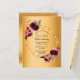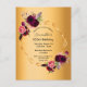 On front: An invitation for a 100th birthday party. An elegant and glamourous faux gold metallic looking background with a faux gold geometric frame. Decorated with dark purple and burgundy flowers, roses and boho style feathers. Templates for a name and party details. The name is written with a hand lettered style script, black