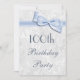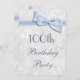 Womens' elegant 100th Birthday Party invitations. Woman's one hundredth / one hundred years old birthday party invites. Beautiful white damask pattern background with a pretty, stylish blue bow and ribbon image. These glamourous, chic, classy invites are beautifully sophisticated and are decorated / printed on both sides. PLEASE NOTE: All invites on Zazzle have flat printed images. Bow and ribbon images purchased from digital-designs-by-elena. If you need any assistance customizing your invitation please contact me through my store and I will be happy to help.
