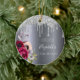 An ornament for a 100th birthday. A dark faux silver metallic looking background. Decorated with dark purple and burgundy and rose pink flowers, faux silver glitter dripping, paint drip look. Templates for a name, date and age 100. The name is written with a white modern hand lettered style script. Perfect as winter party decor, favor, keepsake or a gift.