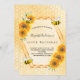 Elégante, amusante, invitation à la fête d'été du 100e anniversaire. Jaune, arrière - plan blanc avec un motif de nid d'abeille. Avec un cadre géométrique en faux or. Décoré de tournesols jaunes et oranges et d'abeilles bourdonnantes. Le nom est écrit avec un script de style moderne écrit à la main. Lettres noires. Idéal pour un thé d'été dans un jardin, jardin. Dos : motif jaune peigne blanche et une joyeuse bumble abeille.