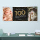 Milestone 100th birthday party banner featuring a trendy black background, 2 large photos, gold glitter and confetti, 100 leopard print hellium balloons, and a custom celebration template that is easy to personalize.