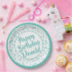 This modern over-the-hill design has a teal and white random number pattern with a teal milestone number 100 repeated in varied sizes and angles over a white background.  There is a white circle in the centre for your text and teal-and-white rings around the rim.