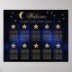Un tableau de 10 tables mariage pour un thème mariage céleste, avec la lune et l'étoile sur un arrière - plan bleu nuit étoilé. Les numéros de table sont écrits dans de grandes étoiles dorées. La lune, les étoiles et le sont dorés. Le mot Welcome est écrit dans un élégant script calligraphique. La photo de nuit étoilée est de Felix Mittermeier de Pixabay et est gratuite pour un usage commercial.