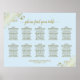 Ce tableau vous aidera à trouver les tables qui vous sont assignées à la réception de votre mariage. Le design est simple mais élégant avec du texte doré sur un arrière - plan bleu clair en poudre. Le titre est écrit dans de belles calligraphies de script lettering et dit : s'il vous plaît trouver votre table. Chic, joli et sophistiqué avec floral en dentelle faux feuille d'or filigree dans les coins. Contient des sièges pour 10 tables à 10 personnes par table ou 100 personnes.