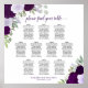 Ce magnifique tableau de sièges mariage comprend 10 tables ornées d'un design floral rustique avec des roses délicatement peints à la main dans les tons violet royal, lavande et prune, avec des accents d'eucalyptus feuilles luxuriants et de verdure du jardin. L'aménagement peut accueillir jusqu'à 100 personnes, avec 10 places disponibles par table. L'élégant titre de calligraphie de script dit "s'il vous plaît trouvez votre table" et les noms du couple et de leur mariage apparaissent en bas. Ce tableau de sièges est à la fois esthétique et fonctionnel, ce qui permet aux invités de repérer facilement leurs sièges désignés tout en ajoutant à la beauté globale de votre réception de mariage.