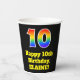 This fun and exciting birthday themed paper cup design features a large number “10” having a rainbow spectrum gradient inspired pattern. It also features the message “Happy 10th Birthday,”, and a custom name. The background is coloured black. Vibrant, colourful paper cups like this might be fun to use at a birthday party/celebration being held to celebrate somebody’s 10th birthday. [~Z0000537]