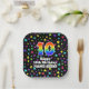 This joyful and exciting birthday paper plate design features a large number “10” with a rainbow spectrum gradient inspired pattern, along with the message “Happy 10th Birthday,”, and a custom name. The background features an exciting and colourful pattern featuring many star shapes with different colours and sizes. Cheerful paper plates like this might be fun to use at a birthday party in honour of somebody’s tenth birthday. [~Z0000582]