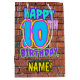 The front of this fun birthday-themed gift bag design features the message “HAPPY 10TH BIRTHDAY,” having a colourful, vibrant, urban street art and graffiti inspired look, in addition to a custom recipient name. The background features a pattern inspired by the look of a brick wall. A vibrant birthday themed gift bag like this might be used when giving a gift or present in celebration of somebody’s tenth birthday. [~Z0000536]