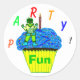 Smiling green space boy robot alien cartoon character Captain Zacky sitting atop a yummy Blue Frosting Chocolate Cupcake with Colourful Sprinkles, and a Festive Red White Flicker Flame Candle. Party letters in colourful typography. Original Artwork Design © 2014 TamiraZDesigns.