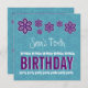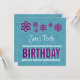 This contemporary design with its purple lace flowers and an aqua background is a fun way to invite folks to a nine year old's birthday party celebration. All text is customizable. You can experiment with different paper types by clicking on the "Invitation Options" tab on the upper right hand corner. I recommend this design on an ice hued metallic paper which gives your invitation a festive shimmer and shine.