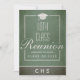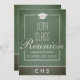 Send your 10th class reunion classmates our elegant flat card invitation. This design template features a green and black shimmery background. The white typography reads "10th Class Reunion" with your school name and year to personalize Below is your school's monogram. The back of the card has more of your celebration details for you to customize. Designed by world renowned artist ©Tim Coffey.