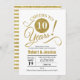 Elegant design in faux glitter gold and white. Features modern typography script font. Cheers to 10 years! Can be personalized into any year.