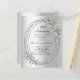 A faux silver looking background. Decorated with greenery and an oval frame. Personalize and add a name and details.