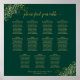 This 11 table seating chart is both simple and elegant with gold text on a lush emerald green background. The design features a lacy script calligraphy title with decorative frilly faux foil filigree in the corners. Stylish, chic and sophisticated way to help your guests find their seats at your wedding reception. It includes table assignments for 110 guests with 10 seats per table.