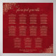 Ce tableau de 11 places est à la fois simple et élégant avec du texte en or pâle sur un arrière - plan rouge pourpre marbré. Le design comporte un titre de calligraphie en dentelle dentelle en dentelle dorée ornée décorative dans les coins. Une façon élégante, chic et sophistiquée d'aider vos invités à trouver leur siège à votre réception de mariage. Il comprend l'assignation de table pour 110 personnes avec 10 places par table.
