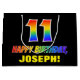 This fun, colourful, and cheerful birthday themed gift bag design features a large number "11" and the message "HAPPY BIRTHDAY,", both coloured with a rainbow spectrum gradient inspired pattern, along with a bold yellow editable recipient name. The background is coloured black. A fun birthday themed gift bag like this might be used to wrap a gift or present being given to somebody who is celebrating their 11th birthday. [~Z0000477]