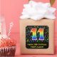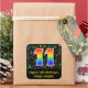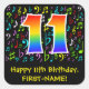 This fun, vibrant, and colourful birthday-themed sticker design features a large number "11" with a rainbow spectrum gradient inspired pattern, along with the message "Happy 11th Birthday,", and an editable name. Part of the background has a pattern of various music notes and symbols having a variety of colours and sizes. Fun, customizable birthday stickers like this might be used as a birthday party decoration, or perhaps given as a birthday present, or perhaps be used when wrapping birthday gifts being given to celebrate a singer’s, a song composer’s, a musician’s, or somebody else’s 11th birthday. [~Z0000423]