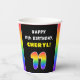 This fun and joyful birthday-themed paper cup design features a big number “11“ with a multicolor rainbow spectrum inspired gradient pattern, along with the message “HAPPY 11th BIRTHDAY,”, and a personalized recipient name. Paper cups like this might be used at a birthday party held in celebration of somebody’s 11th birthday. [~Z0000639]