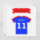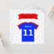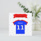These thank you cards match the invitations and other items in the 11th birthday collection. The design shows a red birthday banner and a blue sports t-shirt on a background of little blue stars. Personalize the design of the cards by adding the birthday child's name to the sports t-shirt. The text on the banner can also be customized, or you can use the default "Thank you for coming to my BIRTHDAY PARTY". On the back is a further birthday banner with additional customizable text - the example shown records the date of the party.