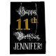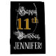 This opulent and ornate birthday themed gift bag design features the message “Happy 11th Birthday,”, along with an editable recipient name. Some of the message is in a luxurious script-style text. The large number “11th” features a faux/imitation gold-inspired look pattern. The background is coloured black. A gift bag like this might be used when giving a gift or present in honour of somebody’s eleventh birthday. [~Z0000560]