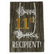 This elaborate and luxurious birthday-themed giftbag design features the message “Happy 11th Birthday,”, along with a custom recipient name. Some of the message is in opulent script-style text, the large number “11th” features an imitation/faux gold-inspired look pattern, and the background has a faux/imitation woodgrain-inspired pattern. A gift bag like this might be used when wrapping gifts being given to somebody in celebration of their 11th birthday. [~Z0000562]