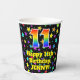 This exciting and joyful birthday-themed paper cup design features a large number “11” with a rainbow spectrum gradient inspired pattern, along with the message “Happy 11th Birthday,”, and an editable name. The background features an exciting and colourful pattern having many star shapes with different sizes and colours. Vibrant, colourful paper cups like this might be fun to use at a birthday celebration being held in celebration of somebody’s eleventh birthday. [~Z0000540]