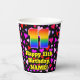 This colorful and fun birthday themed paper cup design features a large number “11” with a rainbow spectrum gradient inspired pattern, along with the message “Happy 11th Birthday,”, and a custom name. The background features a pattern of heart shapes with colors like purple, pink, and red. Happy, loving paper cups like this might be fun to use at a birthday celebration/party being held to celebrate somebody’s 11th birthday. [~Z0000548]