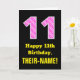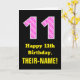 This joyful and fun birthday-themed greeting card design features a large number "11" with a light pink and dark pink stripes pattern containing heart shapes on the front. The front also features the birthday greeting message "Happy 11th Birthday,", and a personalized recipient name. The inside features a custom birthday greeting message, or could perhaps be cleared and left blank if a message is to be written by hand instead. A personalized birthday card like this might be a fun way to acknowledge somebody’s eleventh birthday. [~Z0000434]