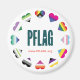 Un aimant avec le logo PFLAG et 12 coeurs avec des couleurs de divers drapeaux de fierté LGBTQ+.