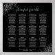 This 12 table wedding seating chart is both simple and elegant. It includes table assignments for 120 guests with 10 seats per table. The design features grey text on a black background with a lacy script calligraphy title. The corners are decorated with a frilly faux foil silver filigree with curls and swirls. Stylish, chic and sophisticated way to help your guests find their seats at your reception.