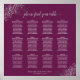 This 12 table wedding seating chart is both simple and elegant. It includes table assignments for 120 guests with 10 seats per table. The design features grey text on a magenta or cassis purple background with a lacy script calligraphy title. The corners are decorated with a frilly faux foil silver filigree with curls and swirls. Stylish, chic and sophisticated way to help your guests find their seats at your reception.