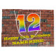 This fun and colourful birthday-themed giftbag design, inspired by urban art and graffiti, features a large number "12" with a rainbow spectrum gradient inspired pattern, along with the message "Happy 12th Birthday,", and a custom name. The background features a brick wall inspired pattern. A giftbag like this might be used when giving a gift or present in honour of somebody’s twelfth birthday. [~Z0000522]
