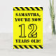 The front of this attention-grabbing and bold birthday themed greeting card design features a custom name and the message "YOU’RE NOW 12 YEARS OLD!" in black stencil inspired text on a yellow coloured background. The front also features an eye-catching yellow and black striped pattern at the top and bottom edges. The inside features a custom birthday greeting message, or could perhaps be cleared and left blank if a message is to be written by hand instead. A personalized birthday card like this might be a fun way to acknowledge somebody’s twelfth birthday. [~Z0000413]