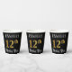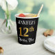 This luxurious and ornate birthday themed paper cup design features a custom name and the message “12th Birthday Party”. The large number “12th” has an imitation/faux gold-inspired colouring pattern, and the words “Birthday Party” are in fancy script-style text. The background is coloured black by default (although it can be customized). Elegant, fancy paper cups like this might be used at a birthday celebration/party being held to honour somebody’s twelfth birthday. [~Z0000567]