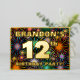 The front of this joyful and eye-catching twelfth birthday celebration foil invitation card design features an editable name, a large number “12th”, the message “BIRTHDAY PARTY!”, and a border. The background of the front has a vibrant, colorful pattern that resembles bursting celebratory fireworks. The back features personalized details about the event, such as the date, time, venue, and any other useful information. Customizable invitations like these might be a fun way to invite guests/attendees to a birthday gathering/party being held in celebration of somebody’s 12th birthday. [~Z0000602]