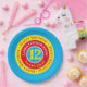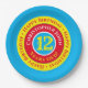 Child's Paper birthday party plates for a 12th Birthday. Birthday party plates with an inscription. Saying a repeated "Happy Birthday". To Celebrate a birthday. Also the name of the child whose birthday it is.