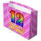 This happy and fun 12th birthday-themed gift bag design features a large number "12" having a pattern inspired by the appearance of a rainbow spectrum. It also features the message "Happy 12th Birthday,", and a customizable name. The background features a cheerful pattern of dark pink and light pink stripes containing loving pink heart shapes. Gift bags like this might be used when wrapping gifts or presents being given to somebody who is celebrating their twelfth birthday. [~Z0000414]