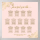 This beautiful 13 table wedding seating chart includes table assignments for 130 guests with 10 seats per table. The design features gold text on a light blush pink coloured background with a lacy script calligraphy title. The corners are decorated with a frilly faux foil filigree with curls and swirls making it both simple and elegant. Stylish, chic and sophisticated way to help your guests find their seats at your reception.