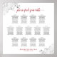 This beautiful 13 table wedding seating chart includes table assignments for 130 guests with 10 seats per table. The design features dark gray and red text on a white background with a lacy script calligraphy title. The corners are decorated with a frilly faux foil silver filigree with curls and swirls making it both simple and elegant. Stylish, chic and sophisticated way to help your guests find their seats at your reception.