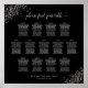 This beautiful 13 table wedding seating chart includes table assignments for 130 guests with 10 seats per table. The design features pale gray text on a black background with a lacy script calligraphy title. The corners are decorated with a frilly silver faux foil filigree with curls and swirls making it both simple and elegant. Stylish, chic and sophisticated way to help your guests find their seats at your reception.