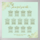 Ce beau tableau de 13 places mariage comprend des assignations de table pour 130 personnes avec 10 places par table. Le design comporte du texte en or sur un arrière - plan vert clair ou de couleur néo-menthe avec un titre de calligraphie de script dentée. Les coins sont décorés d'un faux fil frileux avec des boucles et des tourbillons qui le rendent à la fois simple et élégant. Une façon élégante, chic et sophistiquée d'aider vos clients à trouver leur place à la réception.