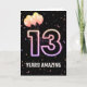 Party balloons and confetti on black background with the neon number 13 for a 13th birthday.