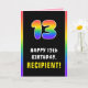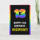 This upbeat and joyful birthday themed greeting card design features a big number “13“ having a vibrant multicolored rainbow spectrum inspired gradient pattern, along with the message “HAPPY 13th BIRTHDAY,”, and a custom recipient name. The inside features a customizable birthday greeting message, or could perhaps be cleared and left blank if a message is to be written by hand instead. A fun, personalized birthday greeting card like this might be used to acknowledge somebody’s thirteenth birthday. [~Z0000636]