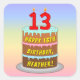 This colourful and joyful birthday-themed square sticker design features a cartoon-style depiction of a three-tier birthday cake having numeral-shaped candles on top showing the number “13“, along with the message “HAPPY 13TH BIRTHDAY,”, and a customizable recipient name. The background features a multi-colour pastel rainbow spectrum inspired gradient pattern. Fun birthday themed stickers like these might be used or distributed at a party celebrating somebody’s thirteenth birthday, or perhaps used when preparing gifts/presents or invitations for such an event. [~Z0000624]