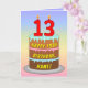 This upbeat and fun birthday greeting card design features a cartoon-style depiction of a three-tier birthday cake having number-shaped candles on top showing the age “13“, along with the message “HAPPY 13TH BIRTHDAY,”, and a personalized recipient name. The background of the front features a multi-colour pastel rainbow spectrum inspired gradient pattern. The inside has a customizable birthday greeting message, or could perhaps be cleared and left blank if a message is to be written by hand instead. A colourful, personalized birthday greeting card like this might be a fun way to deliver a birthday greeting message to somebody who is celebrating their thirteenth birthday. [~Z0000625]