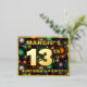 The front of this fun thirteenth birthday party/celebration foil invitation postcard design features an editable name, a large number “13th”, the message “BIRTHDAY PARTY!”, and a border. The background of the front has a vibrant, multicolored pattern that resembles bursting celebratory fireworks. The back features personalized details about the event, such as the date, time, venue, and any other important information. Editable invitations like these might be a fun way to invite attendees/guests to a birthday gathering being held in celebration of somebody’s 13th birthday. [~Z0000609]